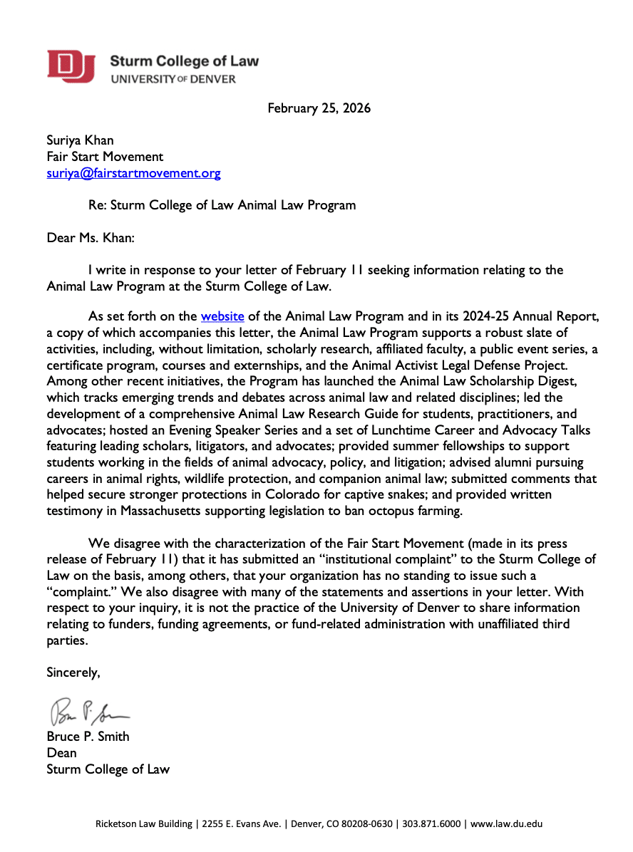 Screenshot 2026-04-03 at 8.13.24 AM by Ryan James Jessup | Apr 3, 2026 ← University of Denver Sturm College of Law Faces Increased Scrutiny I Fair Start Movement